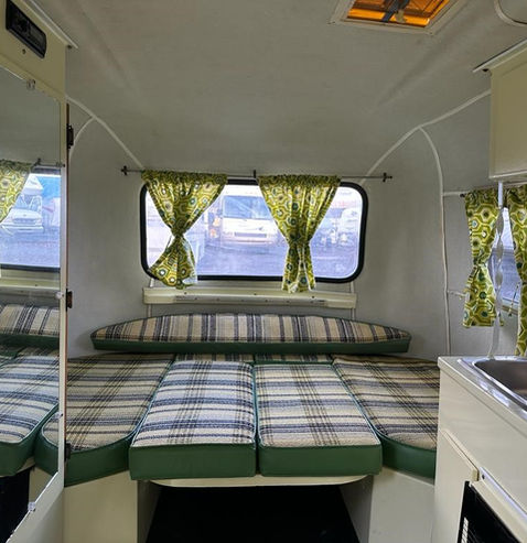 The vintage and unique travel trailer is light weight with new tires, new upholstery and is hard find on the market. Inside is equipped with a sofa up front, kitchen in the middle equipped with a almost new mini 3-way refrigerator, 2 stove top burners, deep bowl sink with stainless steel faucet, furnace and cupboard space for kitchen necessities. Across sits the closet space and at the back is the convertible dinette which fits two people. With a little vent in the center for air way and new seals all around the unit, this incredible trailer is ready to hit the road immediately.