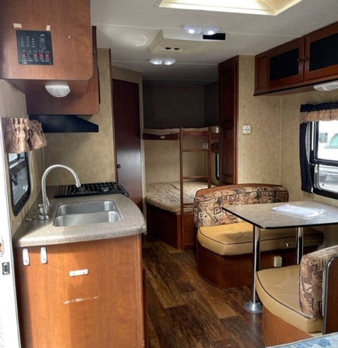 With its unique design being only 25 feet, dry weight of only 4,290 lbs and sleeping capacity of up to 8 people, this beauty is a hard find. A queen size walk around bed with mega storage underneath, compartments on both sides and a TV to make the bedroom up front. The center of the trailer comes with a convertible dinette, a full kitchen with double bowl sink, refrigerator, microwave, oven, 3 stove top burners with overhead fan and light. The back is equipped with 2 large bunk beds, a full bathroom and a wardrobe. This incredible unit is equipped with all appliances such as AC, furnace, hot water tank and a 16-foot power retractable awning.