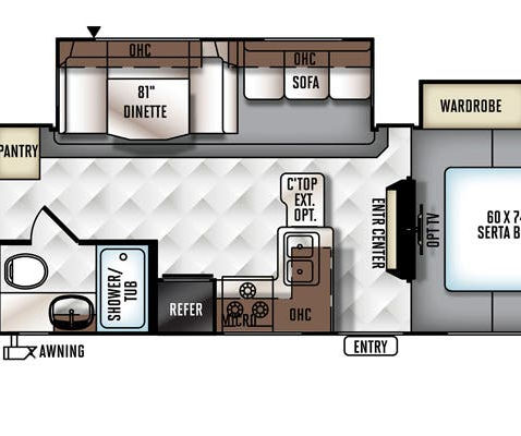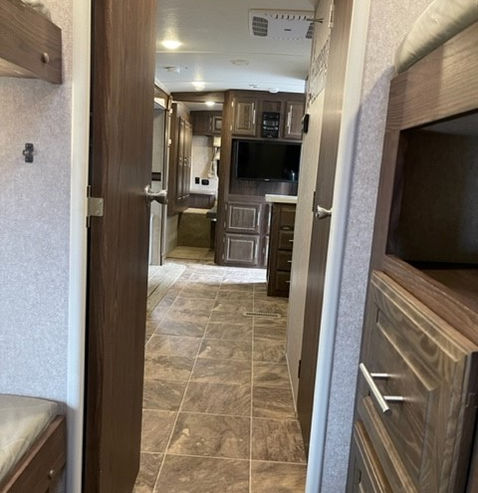 At the front of this beautiful travel trailer is its bedroom with a sliding door on both sides, television, walk around queen size bed, wardrobe sitting on a slide out, overhead compartments and passthrough storage compartment under the bed. In the center sits a convertible sofa with a convertible U-shaped dinette which sits on a large slide out to make the living room large and spacious. Across the slide out is the full kitchen equipped with refrigerator, microwave, oven, 3 stove top burners with light and fan, double bowl sink and plenty of storage space for all kitchen needs and wants. The back of the trailer comes with its own room separated by a full bathroom. The back room is equipped with 3 bunk beds, entertainment ward, a small access door on the driver side and plenty of storage space. Being equipped with all appliances such A/C, furnace, water heater and a full outdoor kitchen equipped with 2 stove top burners, sink, a mini refrigerator, microwave, storage area for necessities, this magnificent unit is ready to hit the road.