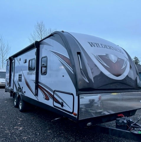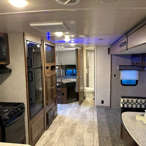 This truly magnificent travel trailer is one of kind and a hard find with its walk around queen size bed up front with night stands on both sides sitting under the closets and overhead compartment. The center is equipped with a convertible U-shaped dinette sitting on a large slide across from the full kitchen. The kitchen is equipped with oven, 3 stove top burners sitting under the fan, light and microwave. A full-size refrigerator, double bowl sink, good amount of counter top space and a ton of cupboard space for all necessities and wants. The back of the travel trailer sits the entertainment center, 2 large bunk beds and a full bathroom. This unit is equipped with all appliances and all appliances come with a one year warranty.