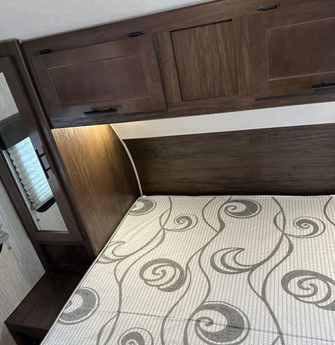 This extraordinary unit comes with a queen-size bed up front with a nightstand plus closets on both sides, an overhead compartment, and doors on both sides for privacy. The center of the travel trailer is equipped with a convertible U-shaped dinette sitting on a slide out for extending the living room, and a beautiful kitchen sitting across from it. The kitchen comes with an oven, three stovetop burners with an overhead fan and light, a microwave, a refrigerator, an extendable faucet, a large, deep bowl sink, and plenty of cupboard space for all kitchen needs and wants. At the back sits the full bathroom with a stand-up shower, foot-flush porcelain toilet, sink with cupboard space under it, and a medicine cabinet on top. With the two bunk beds, a sleeping capacity of up to 8 people, and loaded with all appliances, this incredible unit is ready to go out on the road.